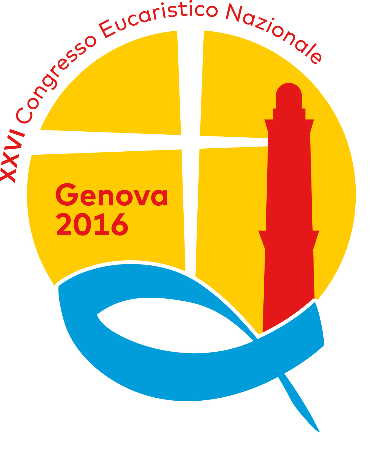 In primo piano, il pesce stilizzato, simbolo dei primi cristiani, diviene rappresentazione iconica del mare. Il cerchio oro rappresenta l’Ostia, l’Eucaristia, solcata da una croce il cui braccio orizzontale è costituito dal fascio di luce emesso dalla Lanterna stilizzata, che da sempre guida verso il porto sicuro, emblema riconosciuto universalmente di Genova.